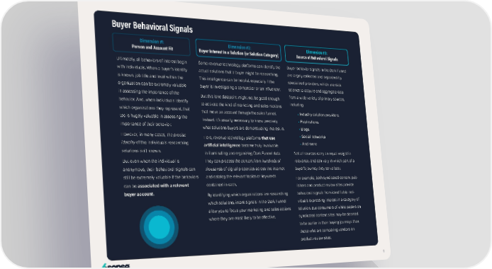 Buyer Behavioral Signals Dimension #1: Dimension #2: Dimension #3: Person and Account Fit Buyer Interest In a Solution (or Solution Category) Source of Behavioral Signals Ultimately, all behaviors of interest begin Some revenue technology platforms can identify the Buyer-behavior signals in the Dark Funnel with individuals. When a buyer’s identity actual solutions that a buyer might be researching. are largely collected and organized by is known, job title and level within the This intelligence can be helpful, especially if the specialized providers, which use data organization can be extremely valuable buyer is investigating a competitor or an influencer. science to acquire and aggregate data in assessing the importance of the But this lone datapoint might not be good enough from a wide variety of primary sources, behavior. And, when individuals identify to activate the kind of marketing and sales motions including: which organizations they represent, that that move an account through the sales funnel. • Industry solution providers too is hugely valuable in assessing the Instead, it’s usually necessary to know precisely • Publications importance of their behavior. what solutions buyers are demonstrating interest in. • Blogs However, in many cases, the precise Here, revenue technology platforms that use • Social networks identity of the individuals researching artificial intelligence become truly invaluable • And more solutions isn’t known. in illuminating and organizing Dark Funnel data. Not all sources carry an equal weight in But even when the individual is They can process the content from hundreds of relevance, and can vary in which part of a anonymous, their behavioral signals can thousands of digital properties across the internet buyer’s journey they serve best. still be extremely valuable if the behaviors and catalog the relevant topics or keywords For example, both syndicated content pub- can be associated with a relevant contained in each. lishers and product review sites provide buyer account. By identifying which organizations are researching behavioral signals from identifiable indi- which solutions, intent signals in the Dark Funnel viduals expressing interest in a category of allow you to focus your marketing and sales actions solution. But consumers of white papers on where they are most likely to be effective. syndicated content sites may be deemed to be earlier in their buying journeys than those who are comparing vendors on product review sites. 11