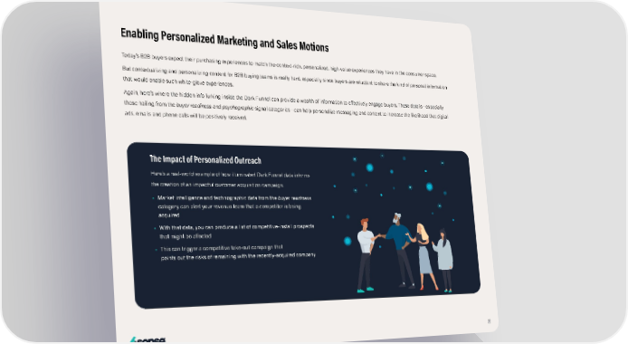 Enabling Personalized Marketing and Sales Motions Today’s B2B buyers expect their purchasing experiences to match the context-rich, personalized, high-value experiences they have in the consumer space. But contextualizing and personalizing content for B2B buying teams is really hard, especially since buyers are reluctant to share the kind of personal information that would enable such white-glove experiences. Again, here’s where the hidden info lurking inside the Dark Funnel can provide a wealth of information to effectively engage buyers. These details—especially those hailing from the buyer readiness and psychographic signal categories—can help personalize messaging and content to increase the likelihood that digital ads, emails and phone calls will be positively received. The Impact of Personalized Outreach Here’s a real-world example of how illuminated Dark Funnel data informs the creation of an impactful customer acquisition campaign: • Market intelligence and technographic data from the buyer readiness category can alert your revenue team that a competitor is being acquired • With that data, you can produce a list of competitive-install prospects that might be affected • This can trigger a competitive take-out campaign that points out the risks of remaining with the recently-acquired company 22