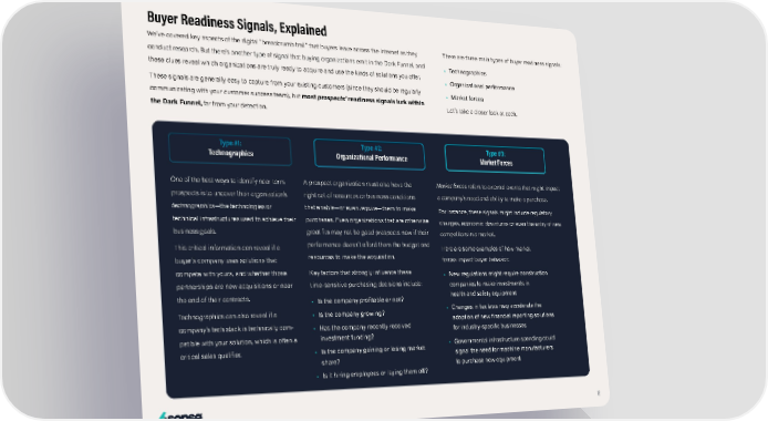 Buyer Readiness Signals, Explained We’ve covered key aspects of the digital “breadcrumb trail” that buyers leave across the internet as they There are three main types of buyer readiness signals: conduct research. But there’s another type of signal that buying organizations emit in the Dark Funnel, and • Technographics these clues reveal which organizations are truly ready to acquire and use the kinds of solutions you offer. • Organizational performance These signals are generally easy to capture from your existing customers (since they should be regularly • Market forces communicating with your customer success team), but most prospects’ readiness signals lurk within Let’s take a closer look at each. the Dark Funnel, far from your detection. Type #1: Type #2: Type #3: Technographics Organizational Performance Market Forces One of the best ways to identify near-term A prospect organization must also have the Market forces refers to external events that might impact prospects is to uncover their organization’s right set of resources or business conditions a company’s need and ability to make a purchase. technographics—the technologies or that enable—or even require—them to make For instance, these signals might include regulatory technical infrastructures used to achieve their purchases. Even organizations that are otherwise changes, economic downturns or even the entry of new business goals. great fits may not be good prospects now if their competitors in a market. This critical information can reveal if a performance doesn’t afford them the budget and Here are some examples of how market buyer’s company uses solutions that resources to make the acquisition. forces impact buyer behavior: compete with yours, and whether those Key factors that strongly influence these • New regulations might require construction partnerships are new acquisitions or near time-sensitive purchasing decisions include: companies to make investments in the end of their contracts. • Is the company profitable or not? health and safety equipment Technographics can also reveal if a • Is the company growing? • Changes in tax laws may accelerate the company’s tech stack is technically com- adoption of new financial reporting solutions • Has the company recently received for industry-specific businesses patible with your solution, which is often a investment funding? critical sales qualifier. • Is the company gaining or losing market • Governmental infrastructure spending could share? signal the need for machine manufacturers to purchase new equipment • Is it hiring employees or laying them off? 12