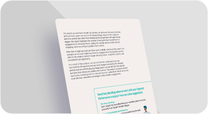 The results you see here should look familiar, as these are the same activities and summary values we saw on the Buying Stage report for this segment and time period. But rather than displaying the progression through buying stages, this report highlights the number of accounts that moved from no engagement to showing intent, visiting the website anonymously, directly engaging, and converting to pipeline and revenue. Note that a single account can show up in multiple columns in this report. For example, an account might have had no engagement in the baseline period, while in the analysis period it began showing intent, visited the website, and converted to an opportunity. As a result of this analysis, we can see that the marketing team was successful in driving increased account engagement during the analysis period, and like with the Buying Stage report, we can drill into the specific activities that influenced pipeline and revenue. This analysis provides another way for the marketing team to measure success, understand which tactics are most effective, and refine campaigns to drive further engagement. Need help deciding where to start with your Segment Performance analysis? Here are a few suggestions. Territory warmup: Gain insight into how effectively your marketing team is moving accounts from Target into later stages. Keyword campaign performance: Understand which keywords are performing the best. Deep-dive on content viewed by segment: Focus on which content is influencing pipeline. Event engagement: Learn if and how attendees are interacting with sales and marketing prior to attending. Competitor takeout: See if customers of your competitors are engaging more with your brand. 6sense.com | (415) 212-9225