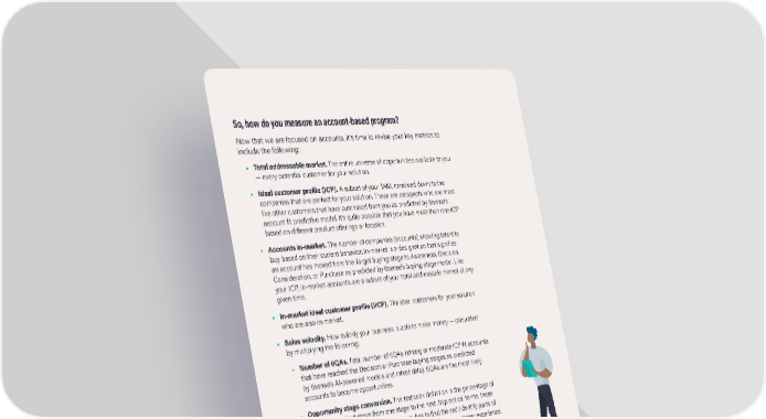So, how do you measure an account-based program? Now that we are focused on accounts, it’s time to revise your key metrics to include the following: • Total addressable market. The entire universe of opportunities available to you — every potential customer for your solution. • Ideal customer profile (ICP). A subset of your TAM, narrowed down to the companies that are perfect for your solution. These are prospects who are most like other customers that have purchased from you as predicted by 6sense’s account fit predictive model. It’s quite possible that you have more than one ICP based on different product offerings or location. • Accounts in-market. The number of companies (accounts) showing intent to buy based on their current behavior. In-market is a designation that signifies an account has moved from the Target buying stage to Awareness, Decision, Consideration, or Purchase as predicted by 6sense’s buying stage model. Like your ICP, in-market accounts are a subset of your total addressable market at any given time. • In-market ideal customer profile (IICP). The ideal customers for your solution who are also in-market. • Sales velocity. How quickly your business is able to make money — calculated by multiplying the following: ◆ Number of 6QAs. Total number of 6QAs (strong or moderate ICP fit accounts that have reached the Decision or Purchase buying stages as predicted by 6sense’s AI-powered models and intent data). 6QAs are the most likely accounts to become opportunities. ◆ Opportunity stage conversion. The textbook definition is the percentage of opportunities that move from one stage to the next. In practical terms, these are the most critical moments your team has to find the red (identify parts of the process that aren’t working so well) and improve the customer experience. ◆ Average selling price (ASP). The average price your product is sold for. ◆ Win rate. The percent of opportunities proposed or quoted that you have won, or the number of sales opportunities converted divided by the number of opportunities available. ◆ Deal velocity. The average number of days between opening an opportunity Bonus: These and closing the deal. are the metrics • Quotas. Based on the conversion rates for the metrics above it’s possible to define quotas for the number of 6QAs, meetings, opportunities, and revenue that matter to planned for each stage of the sales funnel in a given period of time: week, month, your board. or year. Depending on your specific go-to-market, you may need additional quotas defined related to your funnel. 6sense.com | (415) 212-9225