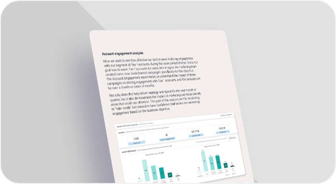 Account engagement analysis Now we want to see how effective our tactics were in driving engagement with our segment of Tier 1 accounts during the same period of time. Since our goal was to warm Tier 1 accounts for sales, let’s imagine the marketing team created some new multichannel campaigns specifically for this objective. The Account Engagement report helps us understand the impact of those campaigns on driving engagement with Tier 1 accounts, and this analysis can be over a month or series of months. Not only does this help inform strategy and spend for the next month or quarter, but it also demonstrates the impact of marketing and helps identify areas that could use attention. The goal of this analysis isn’t for marketing to “take credit,” but instead to have confidence that tactics are increasing engagement based on the business objective. 6sense.com | (415) 212-9225