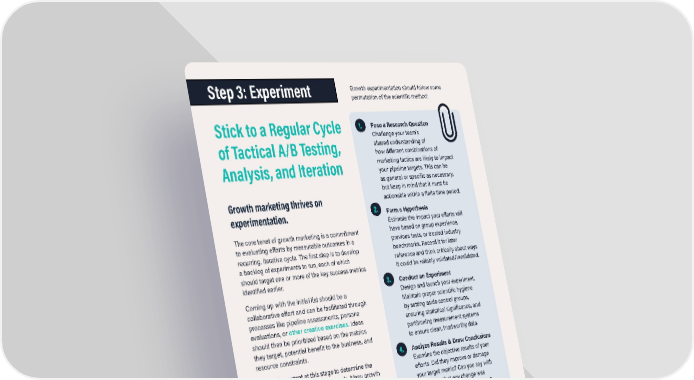 Step 3: Experiment Growth experimentation should follow some permutation of the scientific method: Stick to a Regular Cycle 1. Pose a Research Question Challenge your team’s of Tactical A/B Testing, shared understanding of how different combinations of marketing tactics are likely to impact Analysis, and Iteration your pipeline targets. This can be as general or specific as necessary, but keep in mind that it must be Growth marketing thrives on actionable within a finite time period. experimentation. 2. Form a Hypothesis Estimate the impact your efforts will The core tenet of growth marketing is a commitment have based on group experience, to evaluating efforts by measurable outcomes in a previous tests, or trusted industry recurring, iterative cycle. The first step is to develop benchmarks. Record it for later a backlog of experiments to run, each of which reference and think critically about ways should target one or more of the key success metrics it could be reliably validated/invalidated. identified earlier. 3. Conduct an Experiment Coming up with the initial list should be a Design and launch your experiment. collaborative effort and can be facilitated through Maintain proper scientific hygiene processes like pipeline assessments, persona by setting aside control groups, evaluations, or other creative exercises. Ideas ensuring statistical significance, and should then be prioritized based on the metrics partitioning measurement systems they target, potential benefit to the business, and to ensure clean, trustworthy data. resource constraints. 4. Analyze Results & Draw Conclusions It’s also important at this stage to determine the Examine the objective results of your length of your experimentation cycle. Many growth efforts. Did they improve or damage teams find running experiments on a quarterly your target metric? Can you say with basis to be an effective balance between freedom of confidence that any change was experimentation and urgency of execution. Choose directly attributable to your efforts? a cycle that’s right for your business — and once Come together with your team and it’s been determined, hold yourself accountable for develop a shared understanding of the executing within that time frame. Don’t allow your experiment’s impact. Recognize the team to fall victim to scope creep. difference between assumptions and With a prioritized list of experiments in place, the next additional hypotheses in need of testing. step is to start running tests. 5. Repeat Reprioritize your backlog of experiments and move on to the next one. 10