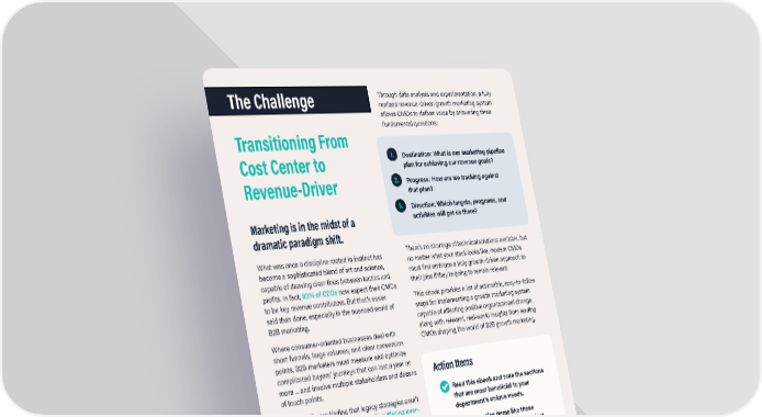 The Challenge Through data analysis and experimentation, a fully realized revenue-driven growth marketing system allows CMOs to deliver value by answering three fundamental questions: Transitioning From 1. Destination: What is our marketing pipeline Cost Center to plan for achieving our revenue goals? Revenue-Driver 2. Progress: How are we tracking against that plan? 3. Direction: Which targets, programs, and Marketing is in the midst of a activities will get us there? dramatic paradigm shift. What was once a discipline rooted in instinct has There’s no shortage of technical solutions available, but become a sophisticated blend of art and science, no matter what your stack looks like, modern CMOs capable of drawing clear lines between tactics and must first embrace a truly growth-driven approach to profits. In fact, 83% of CEOs now expect their CMOs their jobs if they’re going to remain relevant. to be key revenue contributors. But that’s easier This ebook provides a list of actionable, easy-to-follow said than done, especially in the nuanced world of steps for implementing a growth marketing system B2B marketing. capable of affecting positive organizational change, Where consumer-oriented businesses deal with along with relevant, real-world insights from leading short funnels, large volumes, and clear conversion CMOs shaping the world of B2B growth marketing. points, B2B marketers must measure and optimize complicated buyers’ journeys that can last a year or Action Items more ... and involve multiple stakeholders and dozens of touch points. • Read this ebook and note the sections Many CMOs are finding that legacy strategies aren’t that are most beneficial to your up to the task and are consequently suffering ever- department’s unique needs. shortening tenures. • Convert action items like these The Solution: Revenue-Driven into team tasks within your project Growth Marketing management system. • Get in touch with the revenue Growth marketing is a scientific discipline that intelligence experts at 6sense to combines comprehensive measurement with an learn how we empower CMOs to iterative approach to tactical execution — and it’s predictably achieve their growth most effective when it’s driven by revenue. marketing goals. 3